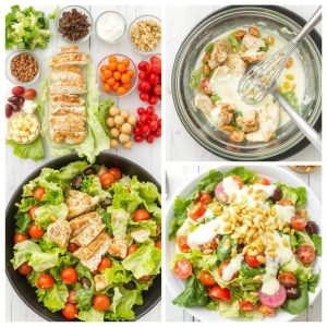 - Lag dressingen ved å blande tahini, sitronsaft, olivenolje, finhakket hvitløk og vann til ønsket konsistens. Smak til med salt og pepper.