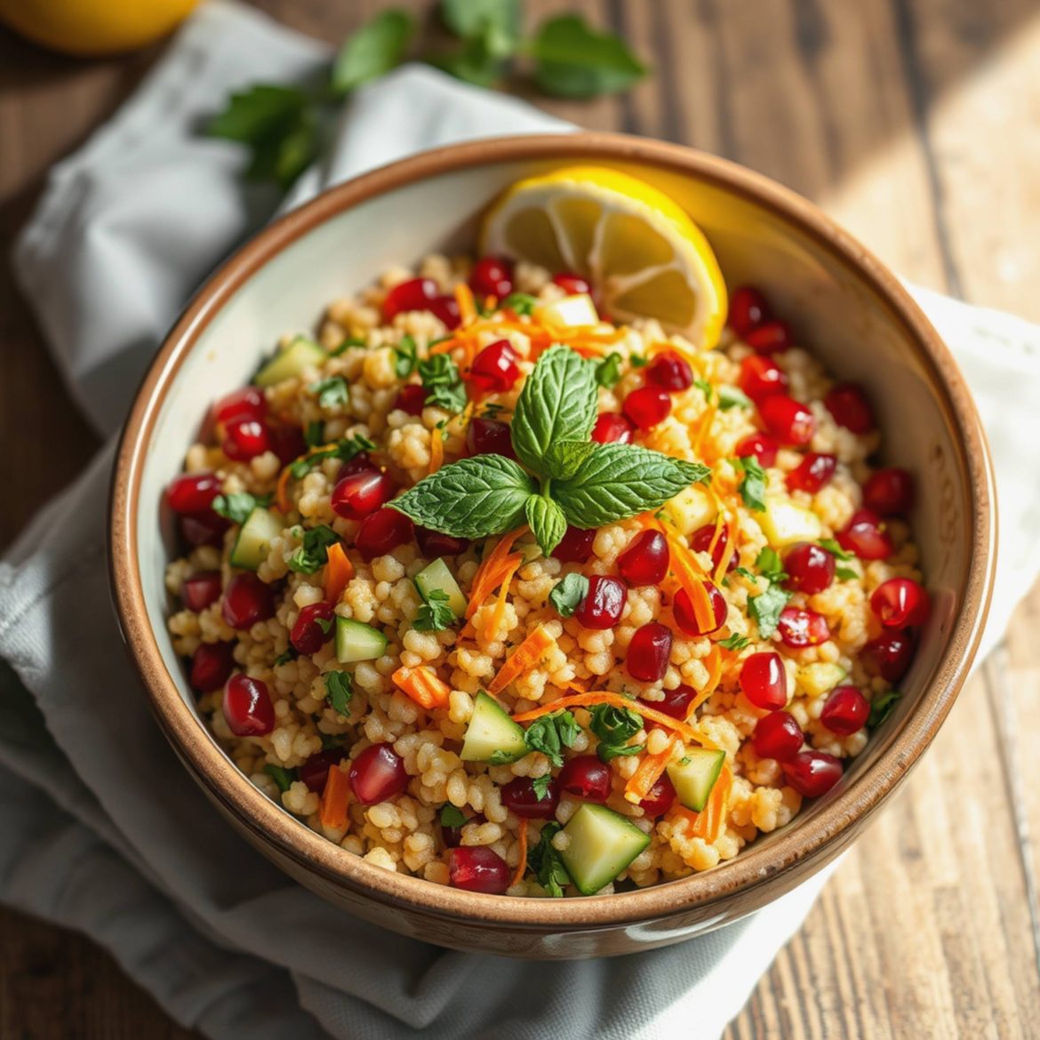 Det beste med denne salaten er hvordan alt spiller sammen. De små, luftige couscouskornene absorberer sitrusdressingen perfekt og gir en mild base. Så får du små eksplosjoner av søte, syrlige granateplekjerner som nærmest popper i munnen. Agurken og gulroten gir crunch og friskhet, mens mynte og persille løfter hele retten med sin grønne, friske aroma. Jeg elsker hvordan smaken av sitron danser lett gjennom hver bit. Det er en salat som føles lett, men som metter godt – og den smaker like godt alene som sammen med annen mat. En ren glede å spise, rett og slett.