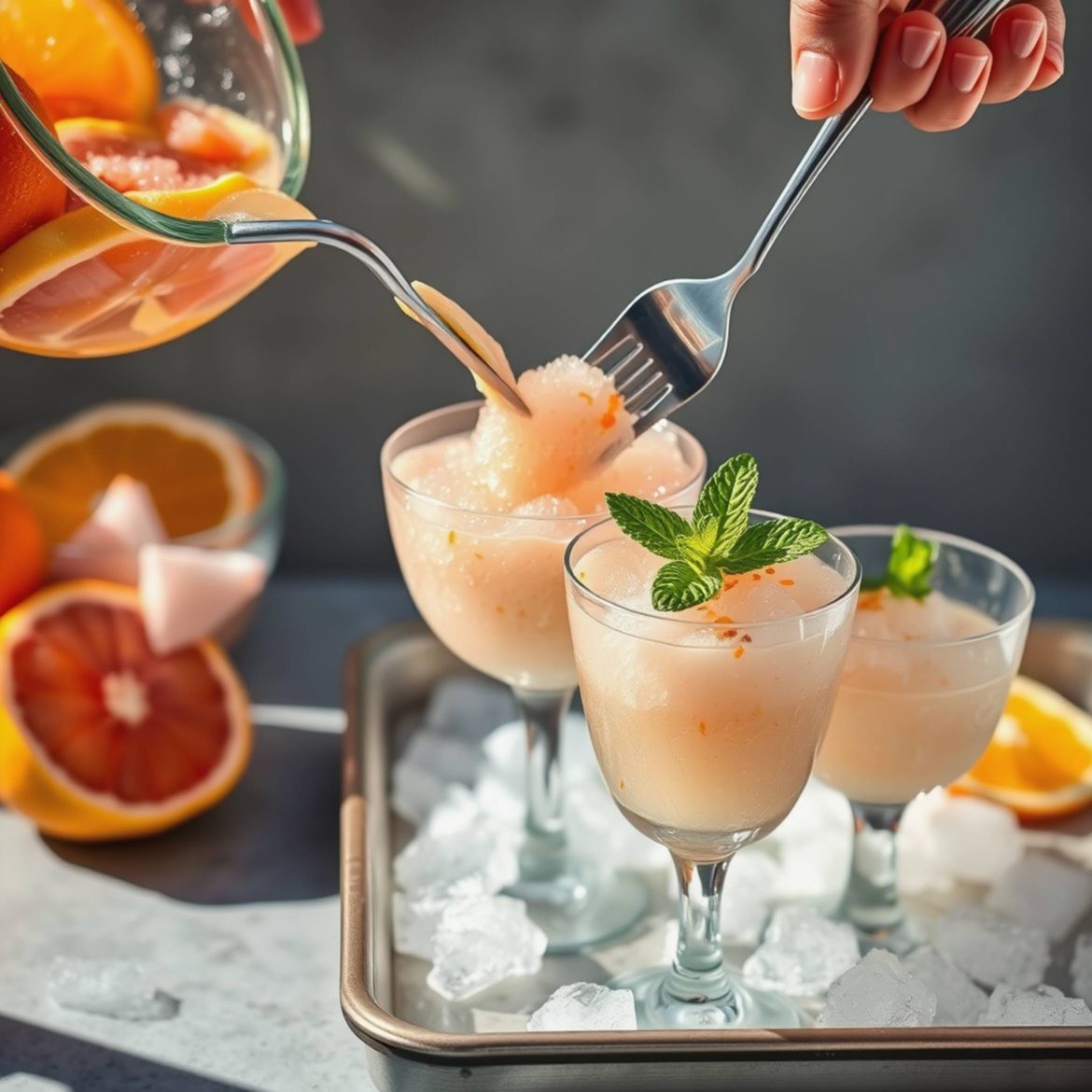 Jeg elsker den kontrasten mellom det bitre og det søte i denne granitéen. Appelsinen gir en rund, varm sødme, mens grapefrukten tilfører en kjølig bitterhet som gjør smaken kompleks og oppfriskende. Ingefæren gir et lite sting i bakgrunnen, som virkelig løfter opplevelsen. Teksturen er det beste – de knasende iskrystallene føles nesten som snø i munnen, men med en solfylt smak. Og så elsker jeg lyden av skjeen som skraper i glasset – det er liksom smaken av sommer, lyd og alt på én gang.