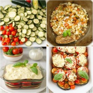 - Kombiner ingrediensene: Legg et lag med stekte aubergineskiver i bunnen av en ildfast form. Hell over tomatblandingen og legg et nytt lag med aubergine på toppen. Gjenta til alle ingrediensene er brukt opp.