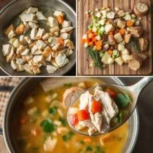 - Småkoking: La suppen småkoke i ca. 30 minutter til grønnsakene er møre og kyllingen er gjennomkokt.