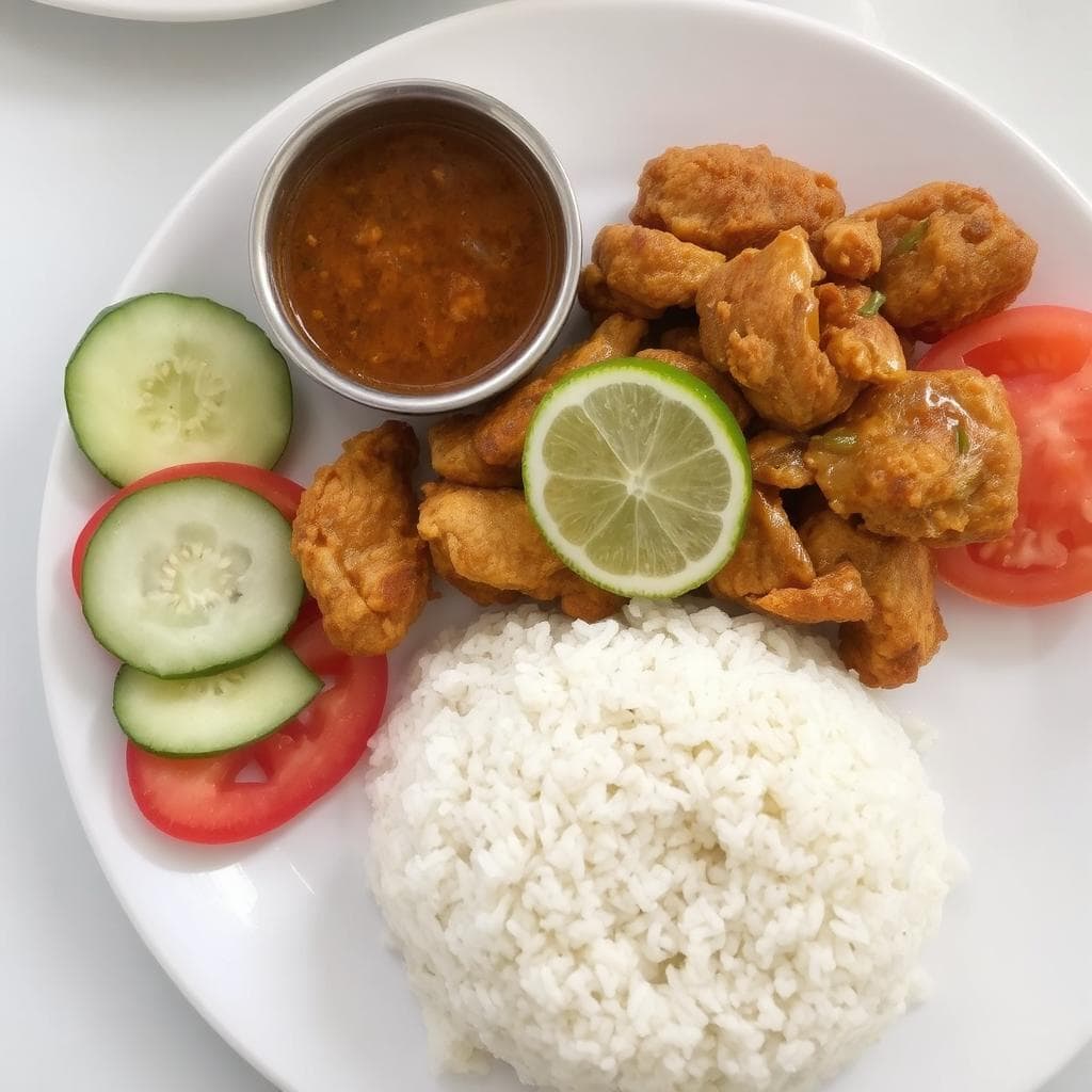 Ayam Penyet er en populær rett fra Øst-Java i Indonesia. Navnet betyr “knust kylling” på indonesisk, og retten består av frityrstekt kylling som knuses eller bankes lett for å gjøre den ekstra mør. Den serveres med sambal (en sterk chilisaus), ris, agurk, tomat og noen ganger stekt tofu og tempeh. Ayam Penyet er kjent for sin sprø overflate, saftige innside og eksplosive smaker fra sambalen. Jeg elsker Ayam Penyet for den deilige kombinasjonen av sprø kylling og den sterke, aromatiske sausen som virkelig vekker smaksløkene!