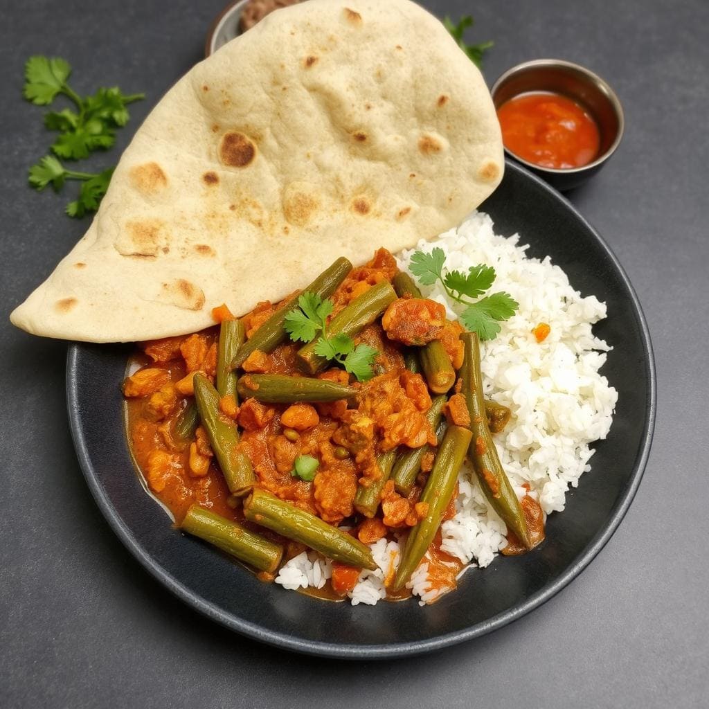 | Raita (yoghurtdressing) | Kjølende kontrast til den krydrede okraen |