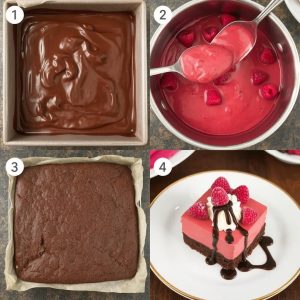 Denne desserten har en fantastisk kombinasjon av smaker og teksturer. Den seige, rike brownien smelter i munnen og har en intens sjokoladesmak. Bringebærmoussen er lett og luftig med en frisk syrlighet som balanserer den tunge sjokoladen. Jeg elsker hvordan den myke moussen møter den kompakte brownien – hver bit er en himmelsk opplevelse!