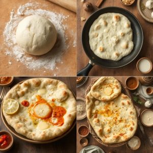 - Stek naan: Varm en non-stick panne eller stekepanne på høy varme. Legg en naan i pannen og stek i 1–2 minutter til bobler dannes. Snu og stek på den andre siden til gyllen.