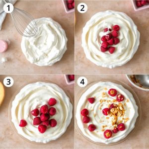 • Bre gresk yoghurt over marengsen, og topp med bringebær, pasjonsfrukt og mandelflak.