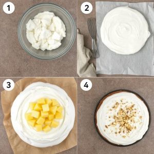 • Montering: Fordel yoghurtkremen over marengsbunnen, topp med ananas, ristede kokosflak og hakkede nøtter.
