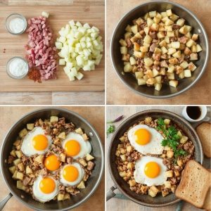 - Server: Fordel hash-en på tallerkener. Topp med posjerte egg og et dryss ferske urter.