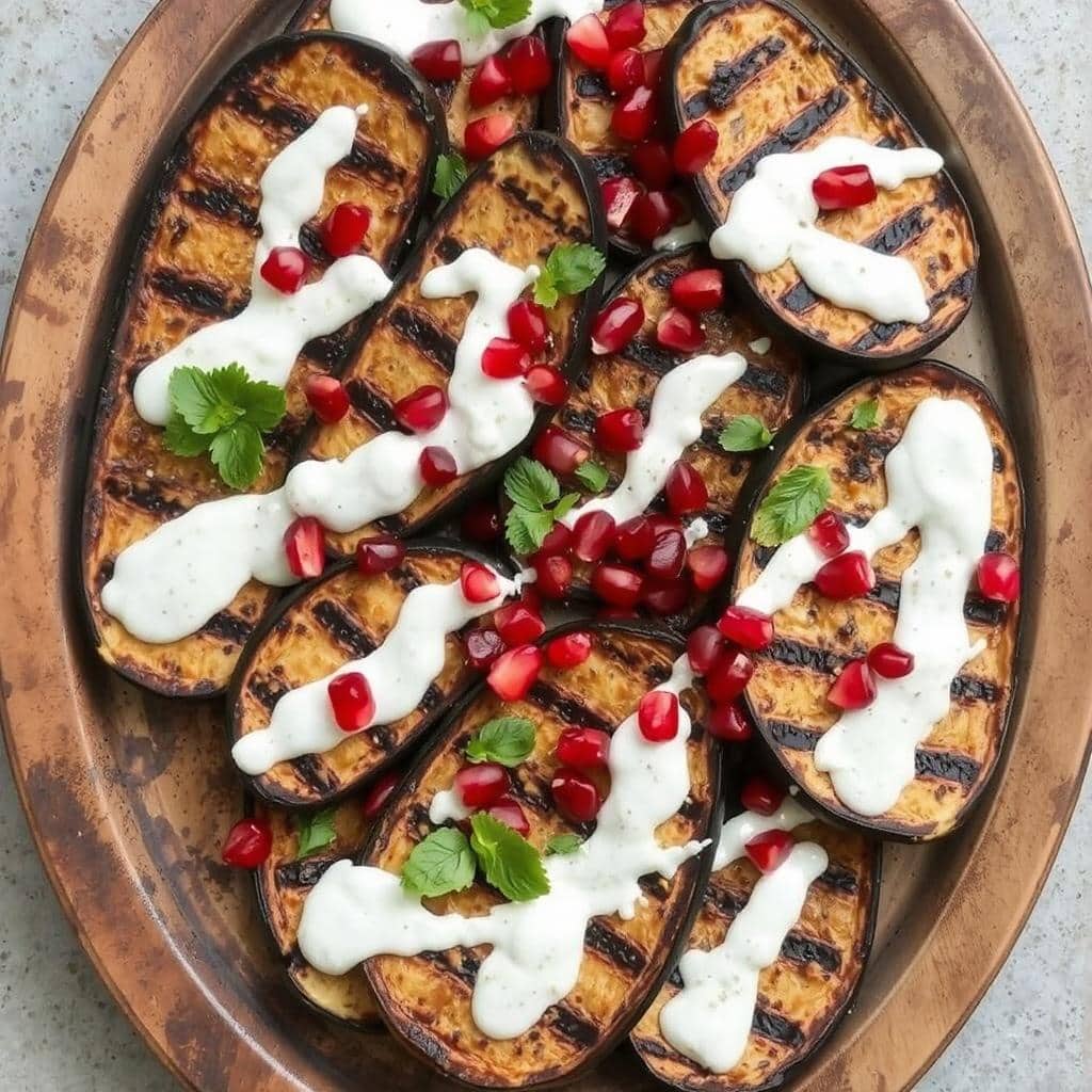 Grillet aubergine med yoghurtsaus er en rett som finner inspirasjon i Midtøstens og Middelhavets kjøkken, der aubergine ofte er stjernen. Retten har blitt populær for sin røykfylte smak, delikate tekstur og den avkjølende kontrasten fra yoghurten. Tradisjonelt har den vært en del av meze-bordet, men i dag fungerer den like godt som en lett middag eller tilbehør til grillmat.