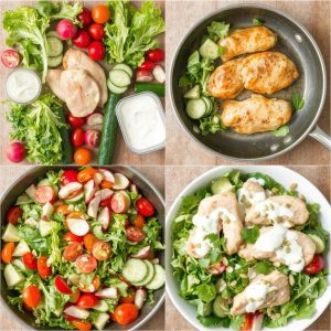 - Bland salaten: Legg grønnsakene i salatbollen, og topp med skiver av kylling. Hell dressingen over rett før servering, og bland forsiktig.