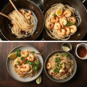 - Tilsett nudler: Ha nudlene, reker og kylling tilbake i woken. Hell over sausen og bland godt. Stek i 2–3 minutter til alt er godt blandet og gjennomvarmt.