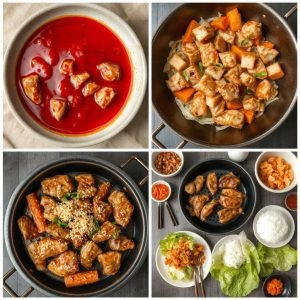 - Mariner kyllingen: Bland sammen gochujang, gochugaru, soyasaus, sukker, sesamolje, hvitløk og ingefær i en bolle. Tilsett kyllingbitene og la dem marinere i minst 30 minutter.