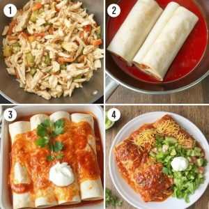Enchiladas stammer fra det meksikanske kjøkkenet og har røtter som går tilbake til aztekernes tid. Navnet kommer fra det spanske ordet “enchilar”, som betyr «å tilsette chili». Tradisjonelt består retten av fylte tortillalefser rullet sammen og toppet med en krydret saus før de gratineres i ovnen. Etter at retten ble kjent i USA på 1800-tallet, ble ulike fyll som kylling, bønner og ost populære varianter. Jeg elsker denne retten fordi den kombinerer saftig kylling, smeltet ost og en deilig krydret saus – perfekt for en kveld hvor man ønsker noe smakfullt og litt eksotisk!