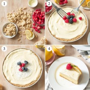 Jeg har laget denne desserten mange ganger, og den er alltid en suksess, spesielt på sommeren. Barna mine elsker den, og jeg liker å eksperimentere med forskjellige toppinger – noen ganger bruker jeg mango eller granateple for en tropisk vri. Et tips fra meg er å bruke frossen sitronskall for ekstra aroma og friskhet. For en mer kremet variant kan du tilsette en skje mascarpone i fyllet. Dessuten er denne desserten best når den får stå i kjøleskapet over natten – det gjør smaken enda bedre, og den blir enklere å skjære i pene stykker.