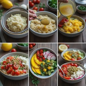 Denne retten er min redning på travle sommerdager – den krever minimalt med innsats, og du kan bruke det du har. Har jeg rester av ovnsbakte grønnsaker, så slenger jeg det i. Eller grillet kylling om jeg vil ha mer protein. Jeg liker å lage en stor porsjon quinoa og oppbevare i kjøleskapet – da er det lett å kaste sammen en bowl når sulten melder seg. Jeg lager alltid litt ekstra dressing og har den klar på glass. Og om du skal ha med noe til sommerpiknik – denne slår alltid an!