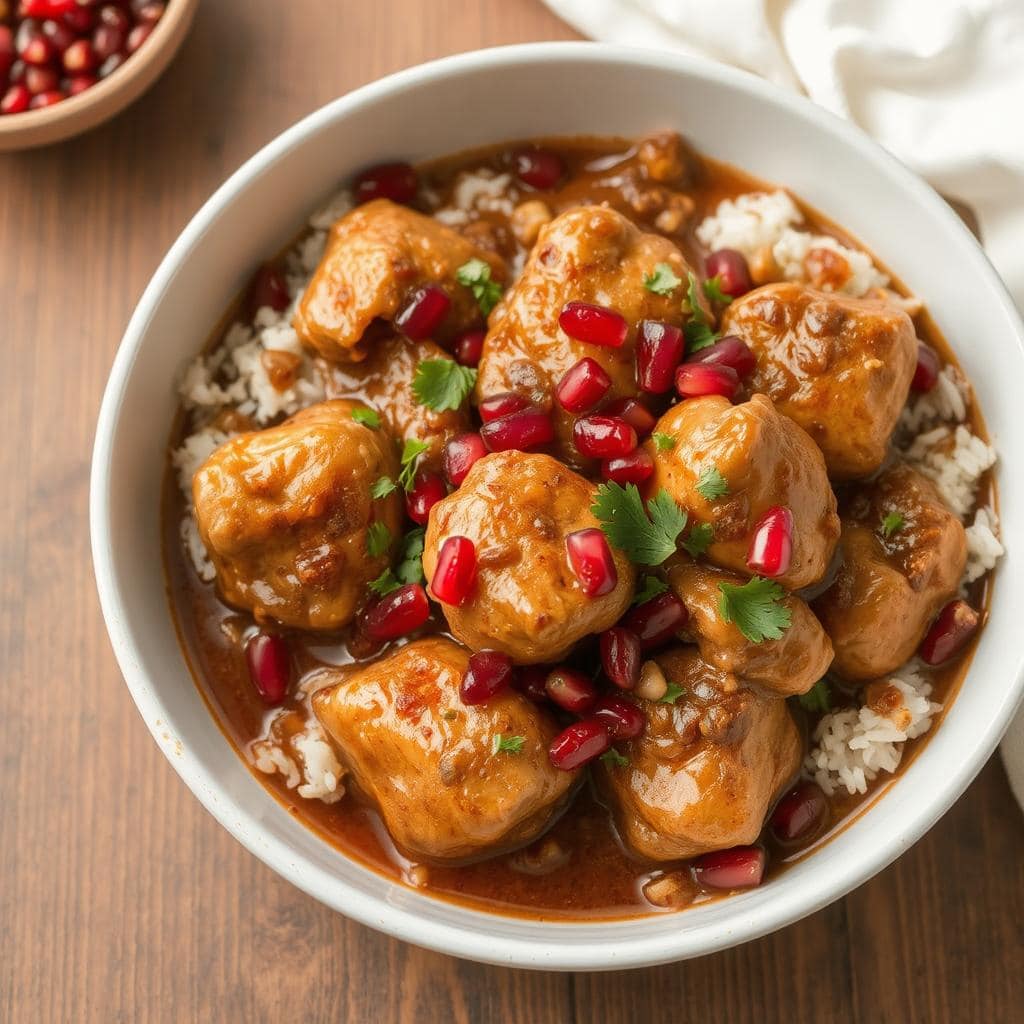 Jeg lager Fesenjan når jeg ønsker en rett som virkelig imponerer gjestene mine med sine lag på lag av smaker. Mitt beste tips er å bruke ferske valnøtter og sørge for å male dem fint for å få en jevn saus. La gryten småkoke lenge nok til at valnøttene slipper oljen sin, noe som gir en dypere smak og en rikere tekstur. Server med fluffy basmatiris for å balansere de kraftige smakene. En av mine beste minner er å nyte Fesenjan på en persisk nyttårsfeiring, hvor duften av valnøtter og granateple fylte kjøkkenet.
