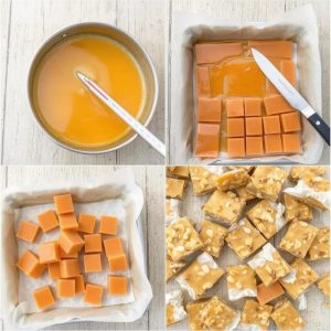 - Smelt sukker, sirup og smør i en tykkbunnet kjele over middels varme. Rør jevnlig til det når 150°C (eller er sprøtt når det dryppes i kaldt vann).