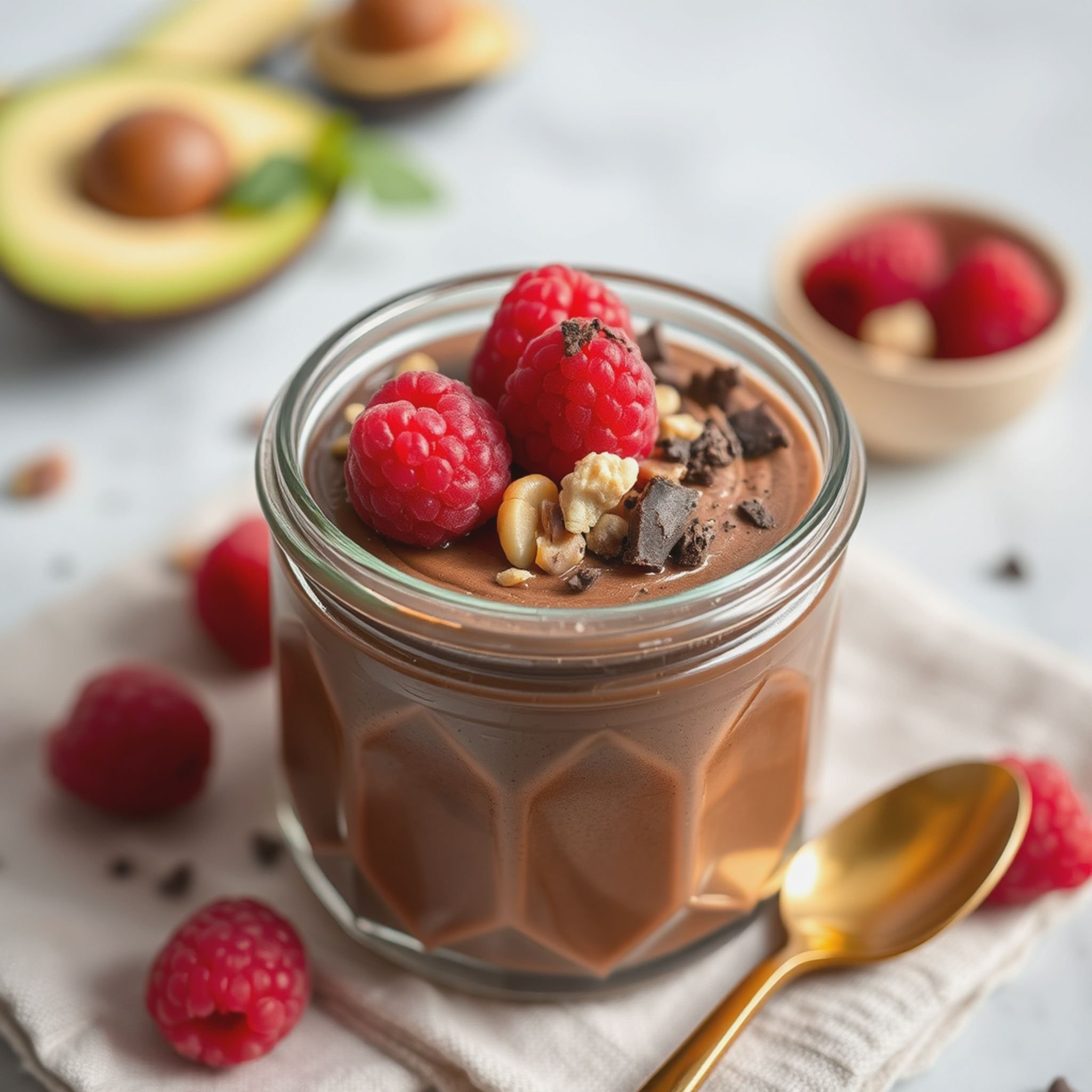 Det som slår meg først når jeg tar en skje, er hvor silkemyk moussen er. Den kjennes som noe mellom sjokoladepudding og fløteiskrem, bare lettere. Avokadoen gjør den rund og fyldig i konsistensen, mens kakaoen gir en rik, mørk sjokoladesmak som virkelig får frem smilet mitt. Den lille sødmen fra bananen balanserer smaken uten at det blir for mektig. Og bringebærene, åh, de tilfører friskhet og et syrlig sting som passer perfekt mot den dype sjokoladetonen. Det er rett og slett en nytelse i hver eneste munnfull.