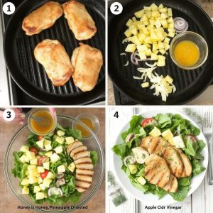 Denne salaten har en fantastisk kombinasjon av smak og tekstur. Kyllingen gir retten et saftig og proteinrikt innslag, mens ananasen tilfører en søt og tropisk smak som passer perfekt sammen med de milde grønnsakene. Den grønne salaten og rødløken gir en friskhet og sprøhet som er et deilig kontrapunkt til den kremete dressingen. Den lette honning- og sennepsdressingen binder ingrediensene sammen og tilfører en subtil krydret sødme. Alt i alt er dette en rett med perfekt balanse, hvor hver bit gir et friskt og mettende inntrykk.