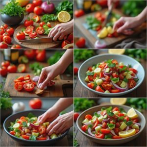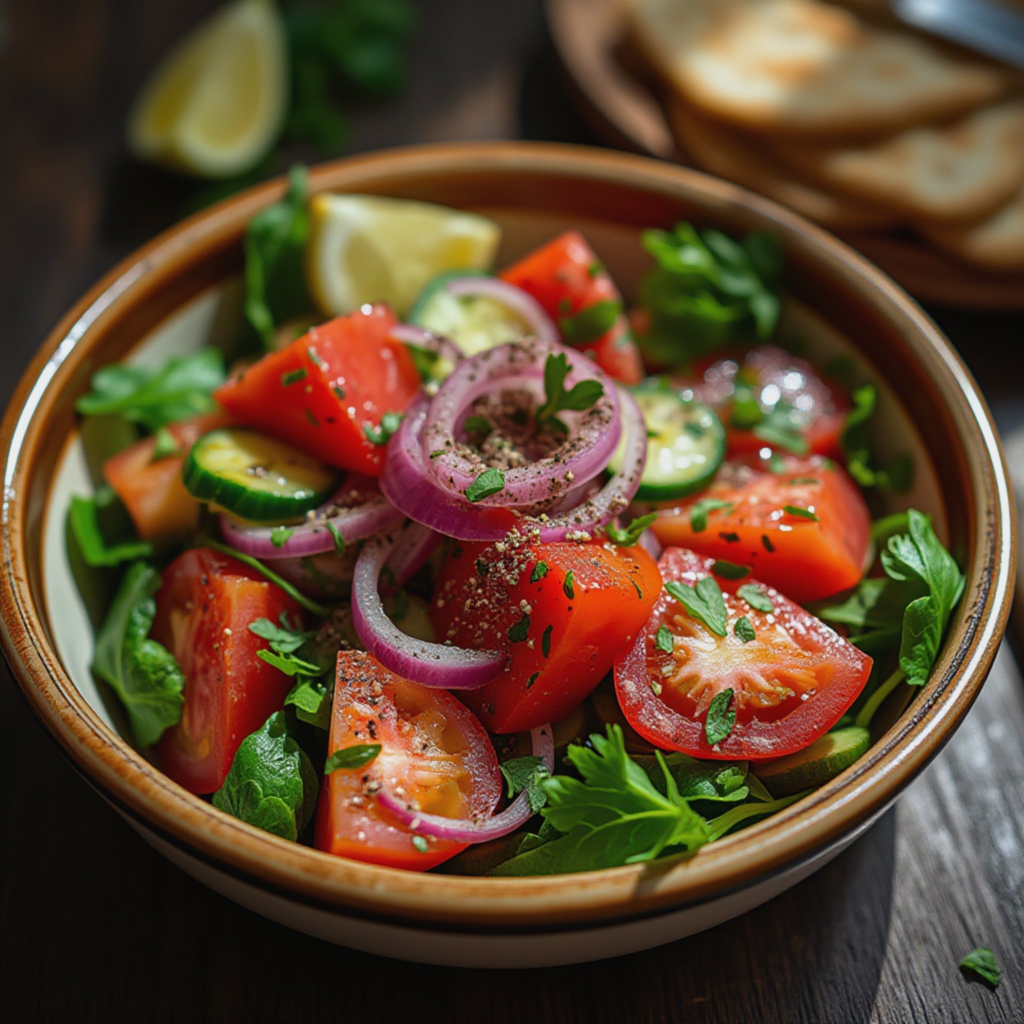 Hver munnfull av denne salaten er som en liten reise til varmere strøk. Jeg elsker hvordan den saftige tomaten møter den sprø agurken og den lille skarpheten fra rødløken. Olivenoljen binder det hele sammen, mens sitronsaften og eddiken gir et friskt løft. Når man topper med hakket persille og eventuelt litt mynte, blir det som en grønn og aromatisk eksplosjon i munnen. Det beste med salaten er at den både er lett, syrlig og full av kontrast – perfekt balansert rett og slett.