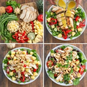 Denne salaten har alt jeg ser etter i en god lunsj eller lett middag. Kyllingen er saftig og mild, perfekt sammen med de friske og søte ananasbitene. Cashewnøttene tilfører en deilig sprø crunch, mens den røde paprikaen og løken gir en mild skarphet.