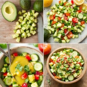 Denne avokadosalaten kombinerer kremet og myk avokado med den sprø og saftige teksturen fra paprika og agurk. Den friske syrligheten fra sitronjuicen balanserer perfekt med avokadoens rike smak. Et lite dryss chiliflak gir en varm undertone, mens koriander tilfører en frisk urteaktig aroma. Hver bit gir en herlig blanding av teksturer og smaker som utfyller hverandre på en balansert måte. Denne salaten er ikke bare deilig, men også en fryd for øyet, med sine friske og sterke farger.