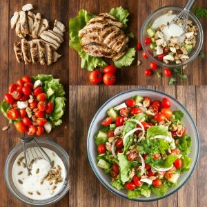 Denne enkle kyllingsalaten er inspirert av middelhavskjøkkenet. Der står rene og naturlige ingredienser i fokus. Jeg oppdaget en lignende rett på ferie i Italia. Friskheten fra grønnsakene og den saftige kyllingen gjorde inntrykk. Jeg tilpasset oppskriften til norske råvarer. En kremet dressing ble prikken over i-en. Nå lager jeg den ofte, både til lunsj og middag. Den er rask, sunn og alltid populær hos familien.