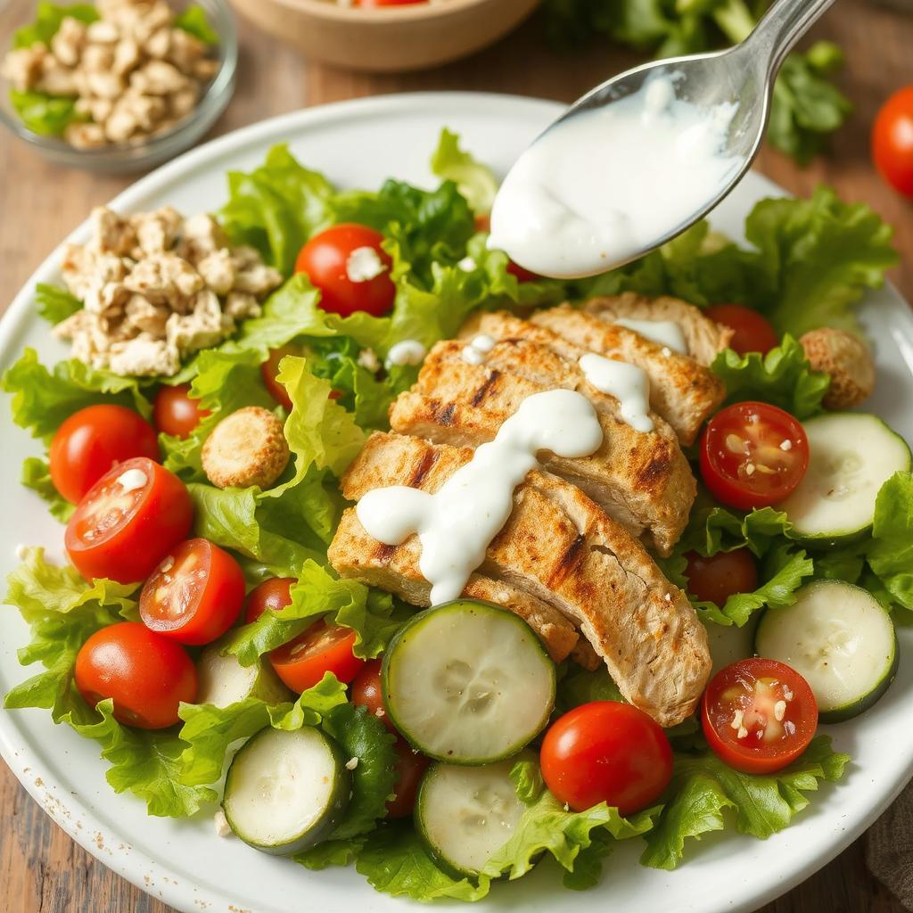 Denne kyllingsalaten er en fryd for smaksløkene. Kyllingen er saftig og lett krydret, med en gyllen og innbydende overflate. Grønnsakene gir en perfekt kontrast av sprøhet og friskhet, mens cherrytomatene tilfører en naturlig sødme. Dressingen, laget av gresk yoghurt og sitronsaft, er silkemyk med en mild syrlighet som balanserer smaken. Ristede gresskarkjerner gir en nøtteaktig crunch og en ekstra dimensjon til retten. Hver munnfull er en harmonisk kombinasjon av teksturer og smaker, noe som gjør denne salaten til et lett, men tilfredsstillende måltid.