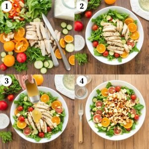 Denne oppskriften stammer fra en dag jeg ønsket noe lett, sunt og raskt til lunsj. Jeg har alltid elsket kombinasjonen av friske grønnsaker, saftig kylling og en syrlig dressing. Ideen fikk jeg etter en tur til Middelhavet, hvor sitrusfrukter og nøtter ofte ble brukt i salater. Den ble raskt en favoritt hjemme, fordi den er så enkel å lage og kan tilpasses med det du har i kjøleskapet. Nå er den mitt “go-to”-alternativ når jeg vil ha en sunn og smakfull lunsj som ikke krever mye tid.