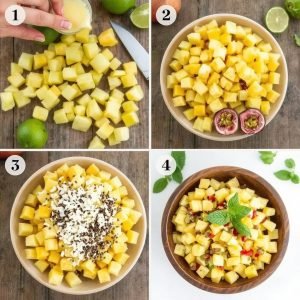 - Bland frukten. Ha ananas, mango og pasjonsfrukt i en stor bolle. Hell over limesaft og honning. Rør forsiktig.