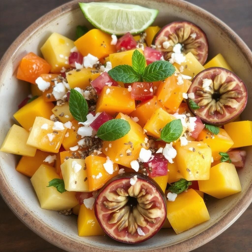 Denne fruktsalaten er en eksplosjon av smaker. Den søte ananasen smelter sammen med den kremete mangoen, mens pasjonsfrukt gir en lett syrlig dybde. Lime og mynte tilfører en friskhet som balanserer sødmen perfekt. Kokosflakene gir et lett crunch, og chiafrøene gir en herlig tekstur som binder alt sammen. Hver bit føles lett, saftig og oppfriskende – som en smak av sommer.