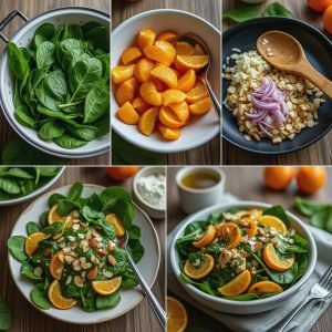 Denne salaten er et friskt lite eventyr på tallerkenen. Den milde, grønne smaken fra spinaten møter den søtsyrlige juicen fra appelsinbitene. Samtidig får du et hint av skarphet fra rødløken og en nydelig crunch fra de ristede mandlene. Dressingen binder det hele sammen med et lite sitruskick som løfter smaken uten å overdøve de naturlige aromaene. Det er en salat som er like mye en smak som en følelse – den føles sunn, levende og veldig tilfredsstillende. Den passer like godt alene som med noe ved siden av.
