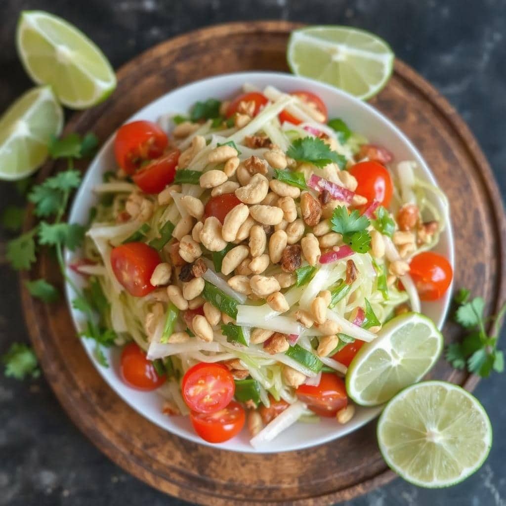 Green papaya salad, også kalt Som Tum, er en klassisk thailandsk rett. Den kombinerer syrlige, søte og krydrede smaker med sprø papaya og smakfull dressing. Retten passer som forrett eller tilbehør til grillet kjøtt. Jeg elsker denne salaten for dens friske smak og balanserte teksturer.