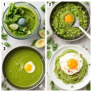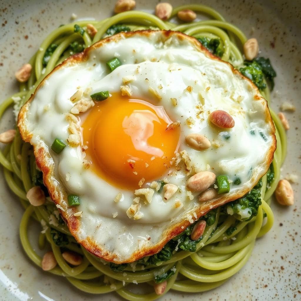 Grønn pasta med stekt egg er en moderne vri på klassisk pasta, inspirert av det beste fra italiensk kjøkken. Denne retten kombinerer en kremet grønn saus laget av spinat og urter med et perfekt stekt egg som prikken over i-en. Ideen kom til meg da jeg ønsket å lage noe enkelt, men likevel imponerende, og resultatet ble denne livlige, smakfulle retten. Nå er den en fast favoritt, spesielt når jeg vil nyte en rask, men raffinert middag.