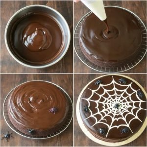 - Lag Spindelvev: Smelt hvit sjokolade eller lag en melisglasur. Lag en sirkel midt på kaken, og tegn deretter sirkulære ringer utover. Bruk en tannpirker til å dra linjer fra midten og ut, slik at det lages et spindelvevsmønster.