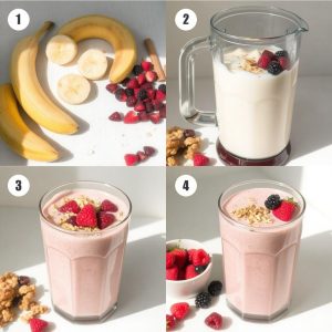 Havremelk-smoothien har sin opprinnelse i den økende populariteten rundt plantebaserte alternativer. Etter hvert som flere ønsket sunne og bærekraftige alternativer til melk, ble havremelk raskt en favoritt for smoothies. Denne oppskriften er inspirert av norske frokoster som ofte er basert på bær og korn. Kombinasjonen av naturlig søt banan, friske bær og havremelk gir en perfekt balanse mellom næring og smak. Jeg har laget min egen versjon med en liten twist – litt kanel og toppet med granola for tekstur. Det er en oppskrift som har blitt en fast del av min hverdag, spesielt på travle morgener.