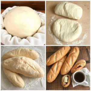 - Forvarm ovnen til 230 °C. Sett en ildfast form med varmt vann i bunnen av ovnen for å skape damp. Stek baguettene i 15–20 minutter til de er gylne og har en sprø skorpe.