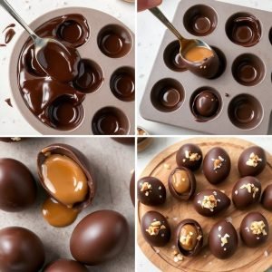 Det første jeg legger merke til når jeg tar en bit, er den dype, intense smaken av mørk sjokolade som knaser lett før den silkemyke karamellen smelter på tungen. Den naturlige sødmen fra dadlene gir karamellen en deilig dybde, mens et hint av havsalt balanserer smaken perfekt. Kokosmelken gir en kremet fylde, og sjokoladens rike smak sørger for en ekte nytelsesopplevelse. Jeg liker å pynte dem med hakkede nøtter eller en klype kakaonibs for en ekstra sprø kontrast. Disse sjokoladeeggene smaker rett og slett som små påskeoverraskelser fulle av kjærlighet.