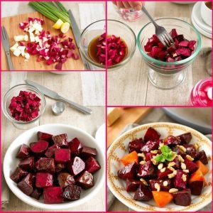 Overfør rødbetene til et serveringsfat. Dryss over friske urter og ristede nøtter for ekstra smak og tekstur.