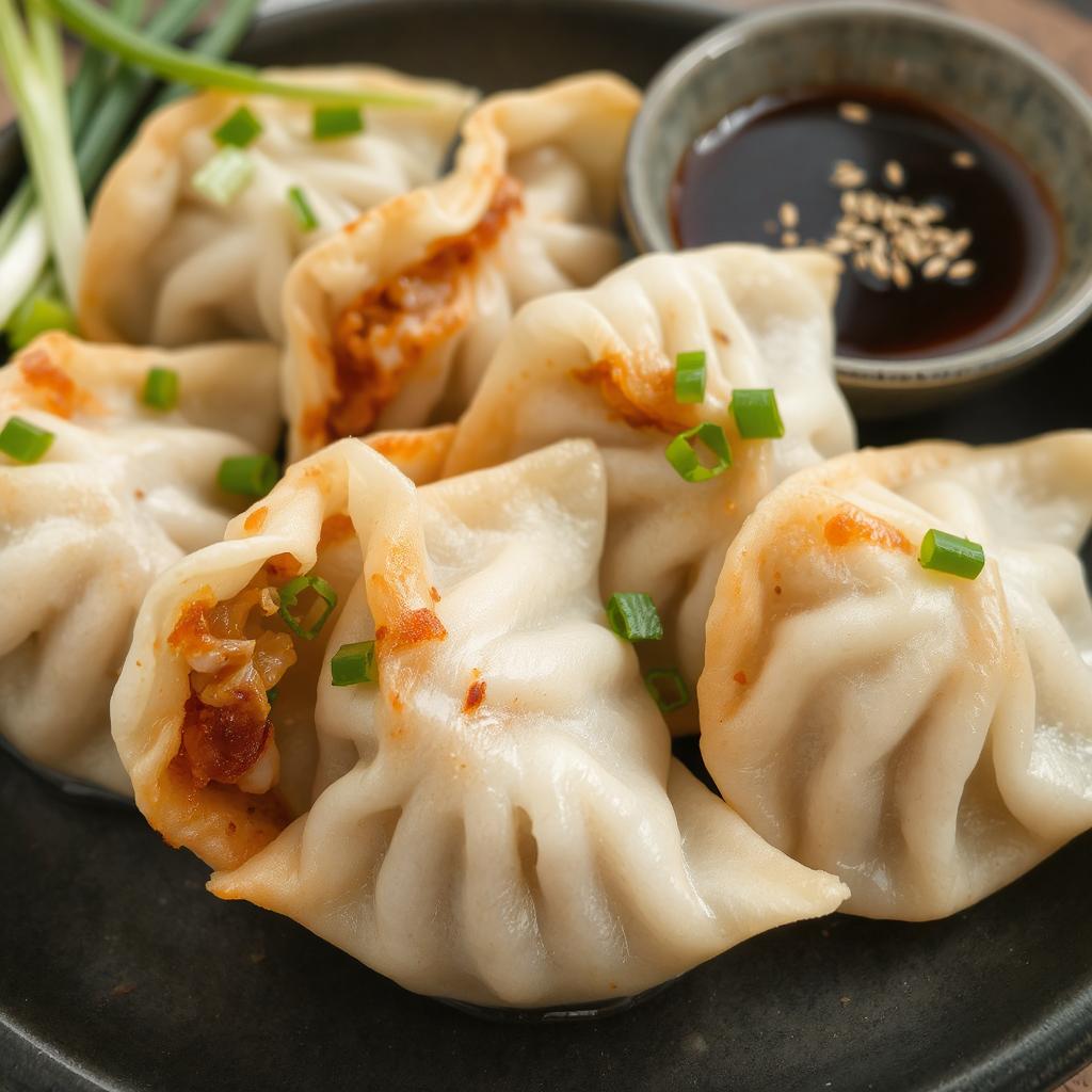 Servering: Legg de varme gyozaene på et fat og server med soyadipp. De smaker best rett fra pannen, med en sprø bunn og saftig fyll.