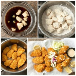 - Forbered til fritering: Tørk lett av overflødig marinade fra kyllingen. Vend kyllingbitene i potetmel slik at de er jevnt dekket.