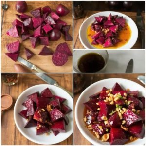 I en stor bolle, bland olivenolje, honning, balsamicoeddik, havsalt og pepper. Vend rødbetene i blandingen til de er godt dekket. - Stek rødbetene: