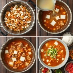 - Server: Server Kimchi Jjigae varm med dampet ris ved siden av.