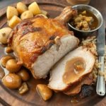 - Kok svineknoken: Legg svineknoken i en stor gryte med vann. Kok opp og skum av. Tilsett laurbærblad og timian, og la knoken trekke på lav varme i 1 time.