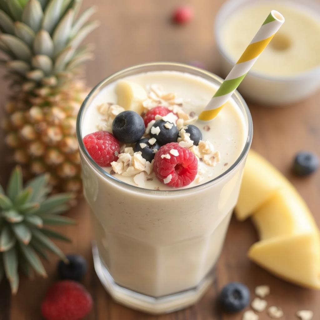 Etter hvert som smoothies ble populære over hele verden, utviklet de seg fra enkle fruktblandinger til næringsrike måltider. Denne ananas-smoothien kombinerer sødme, syrlighet og kremet konsistens på en perfekt måte. Yoghurt gir en silkemyk fylde, mens havregryn gjør den mer mettende. En skvett limejuice balanserer smaken, og litt ingefær tilfører en spennende, lett krydret varme.