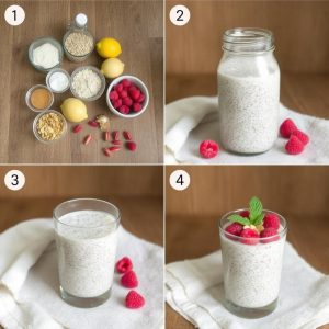 Bland chiafrø, havremelk, vanilje og sitronsaft i en tett glasskrukke eller bolle. Rør godt sammen så frøene ikke klumper seg.