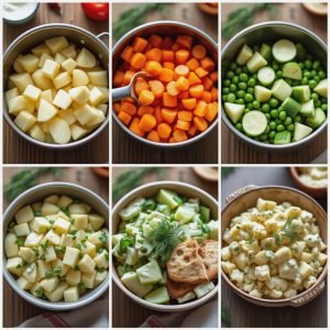 Bland salaten: Vend inn potetene, gulrøttene, ertene, agurken og rødløken i dressingen.