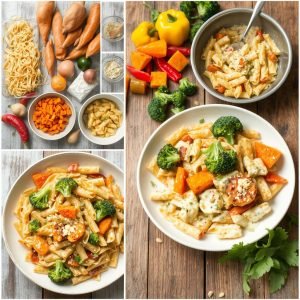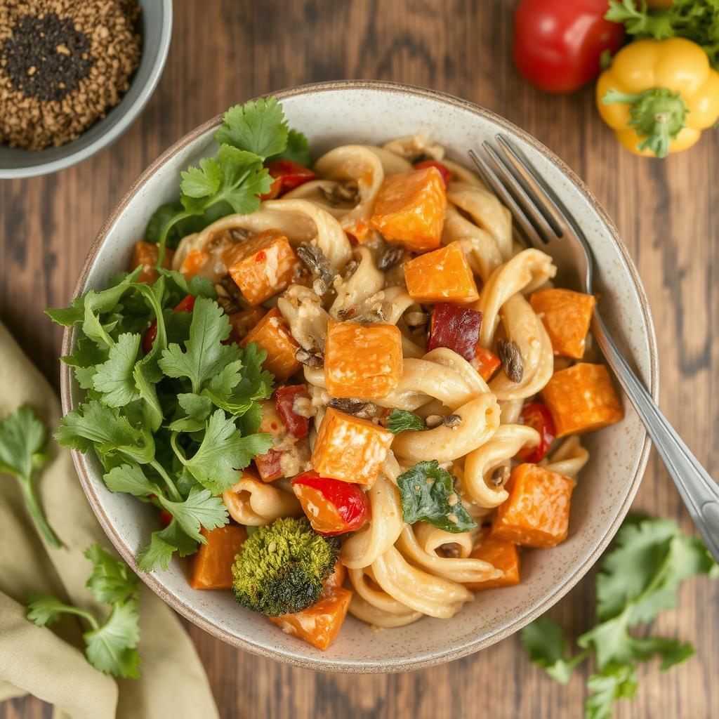 Jeg lager denne retten når jeg vil ha noe sunt og godt. Jeg elsker å bruke friske grønnsaker som er sesongbaserte. Et tips er å tilsette næringsgjær for en ostete smak uten melk. Solsikkefrø på toppen gir en fin crunch!