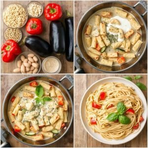 Denne retten er en fest for smaksløkene! Den kremete sausen, laget med plantebasert fløte, binder sammen pastaen og de grillede grønnsakene på en fantastisk måte. Fullkornspastaen gir en rustikk, nøtteaktig tekstur som gjør at retten føles både mettende og tilfredsstillende. De grillede grønnsakene – paprika, aubergine og zucchini – gir en lett røyksmak og en deilig sødme som balanserer den kremete sausen perfekt. Den aromatiske smaken fra timian og oregano gir et ekstra løft og gjør retten til en ekte smaksopplevelse.