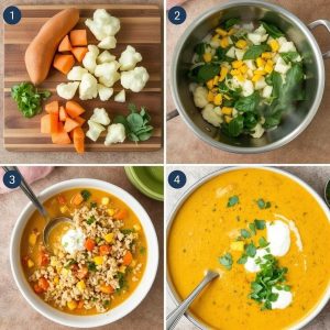 - Kok grønnsakene: Ha i søtpotet og blomkål, og rør godt. Hell over kokosmelk og grønnsakskraft, og tilsett honning. La det småkoke i 20-25 minutter til grønnsakene er møre.